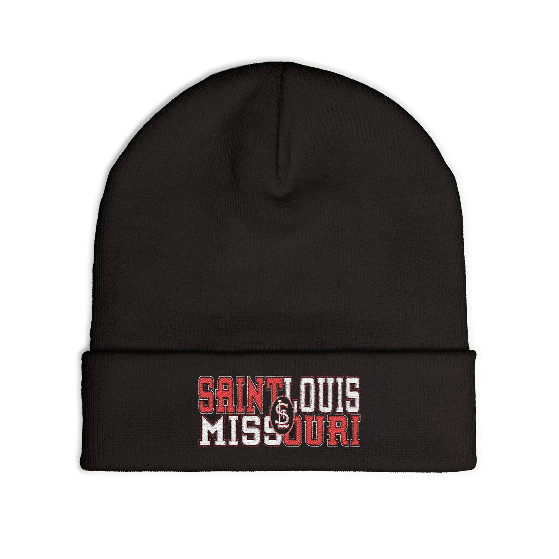 Classic cuffed Beanie with a Saint Louis Missouri split color design, giving a cozy and stylish vibe. Perfect for anyone looking to stay warm in style during the winter season or represent their love for Saint Louis.