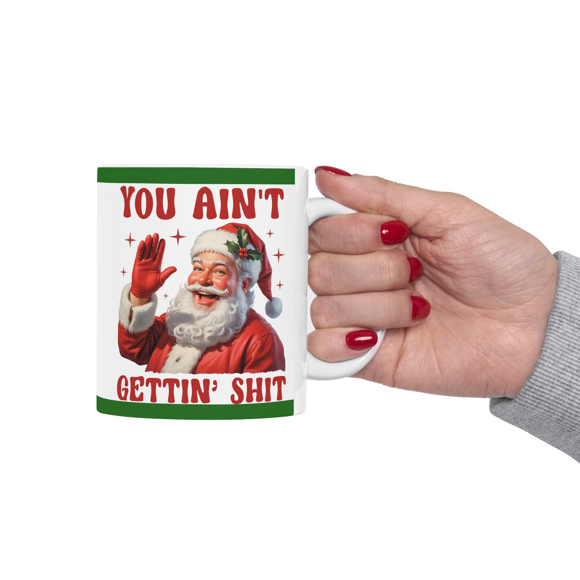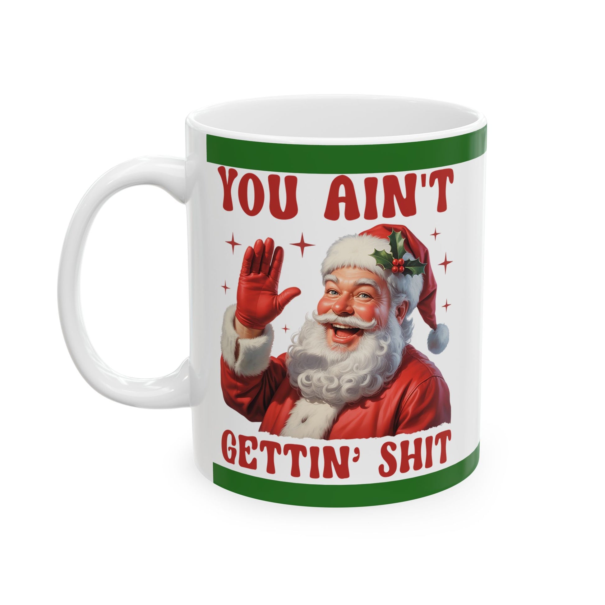 This You Ain't Getting Shit Christmas Santa ceramic mug is perfect for adding a touch of humor to your holiday season. Enjoy your favorite hot beverages in this festive mug that is sure to bring a smile to your face. It makes a great gift for friends and family who appreciate a good laugh during the Christmas season.