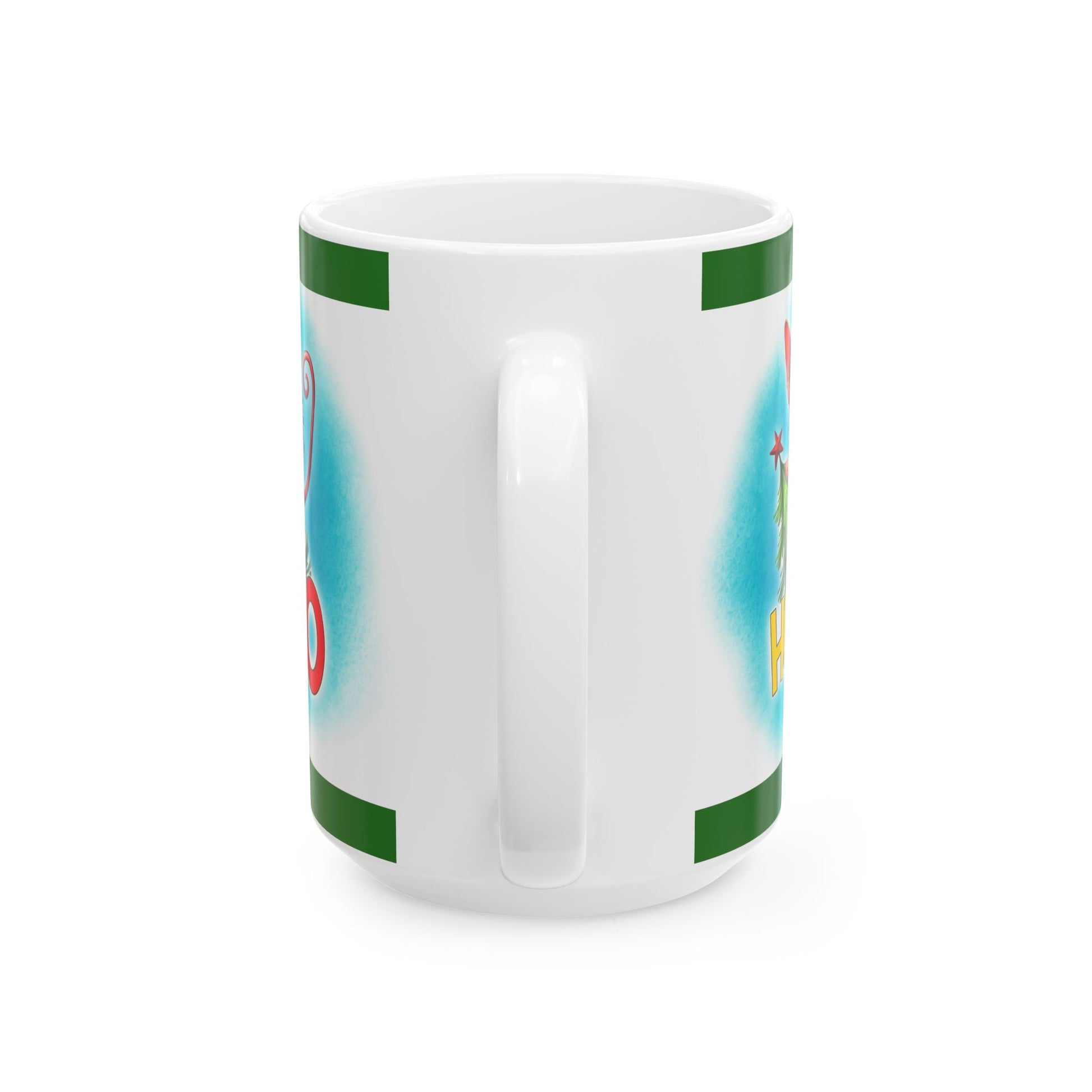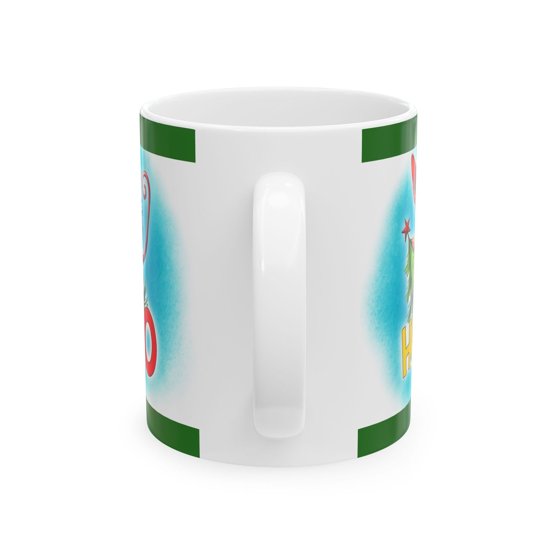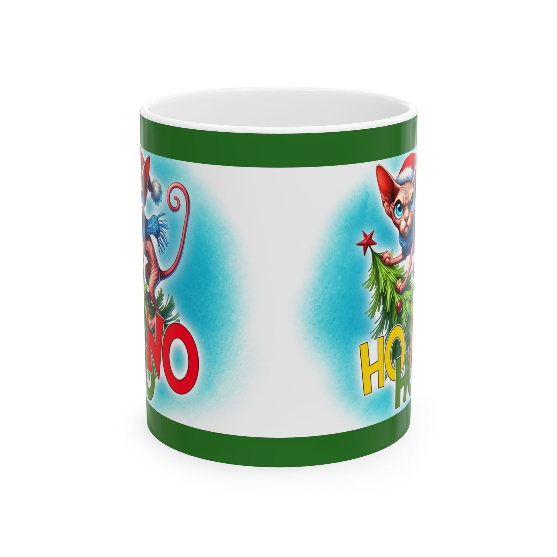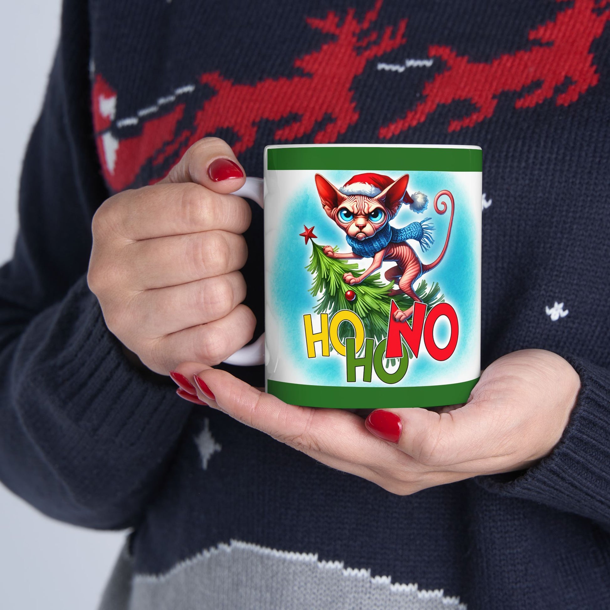 Funny Cat ceramic coffee mug with a festive 'Ho, Ho, No' design perfect for the holiday season. This mug adds a playful touch to your morning routine and makes a great gift for cat lovers and anyone with a sense of humor. Ideal for enjoying hot beverages during Christmas and winter celebrations.