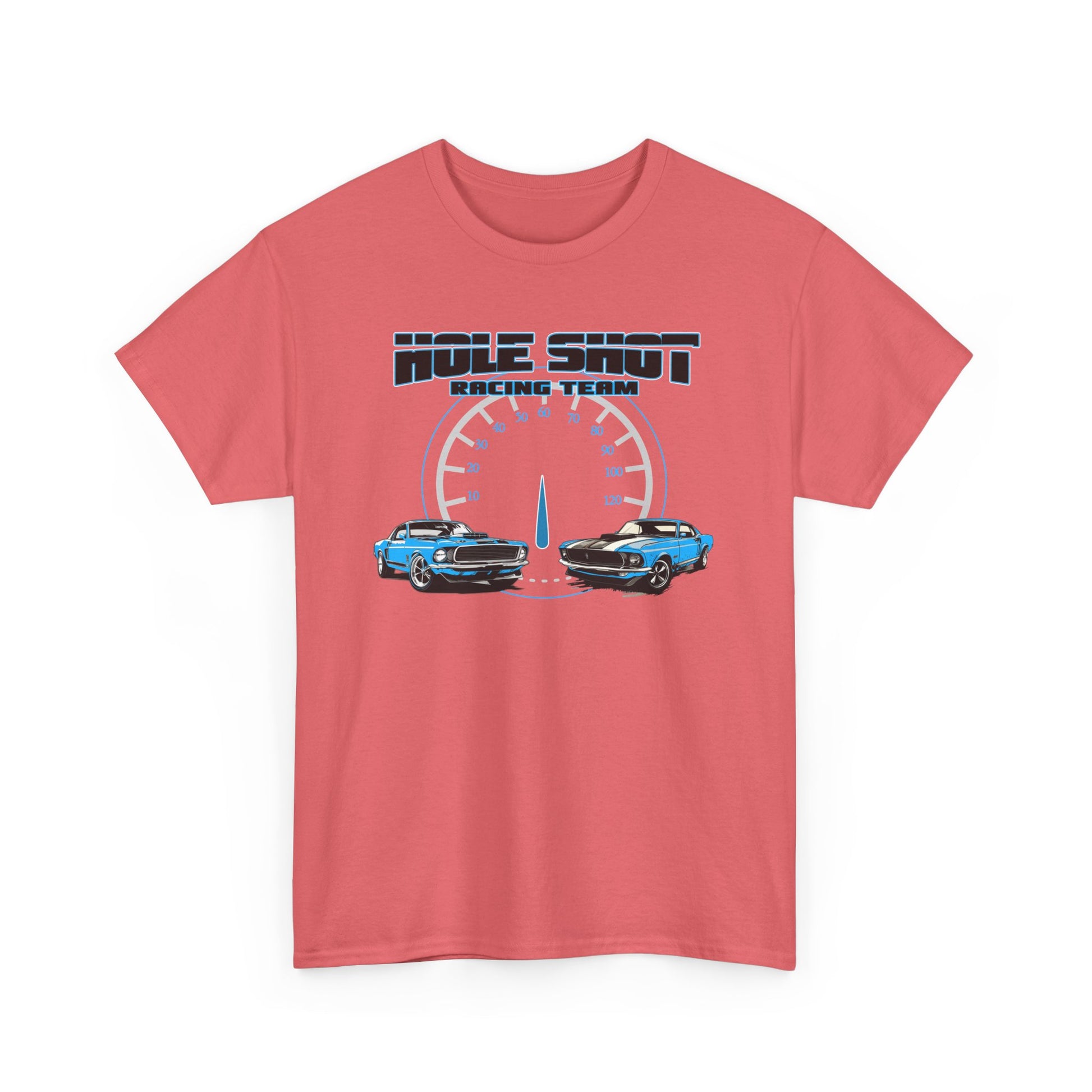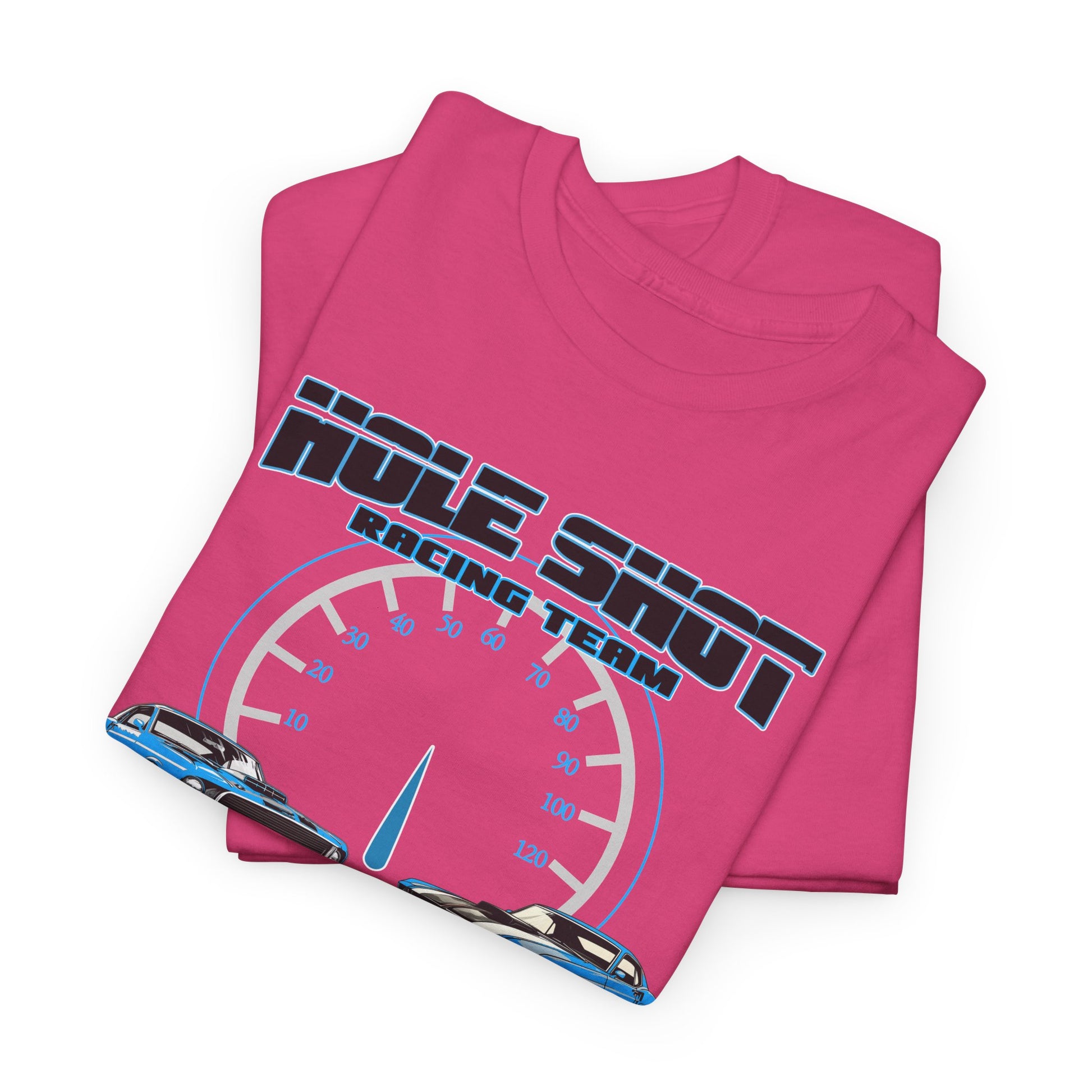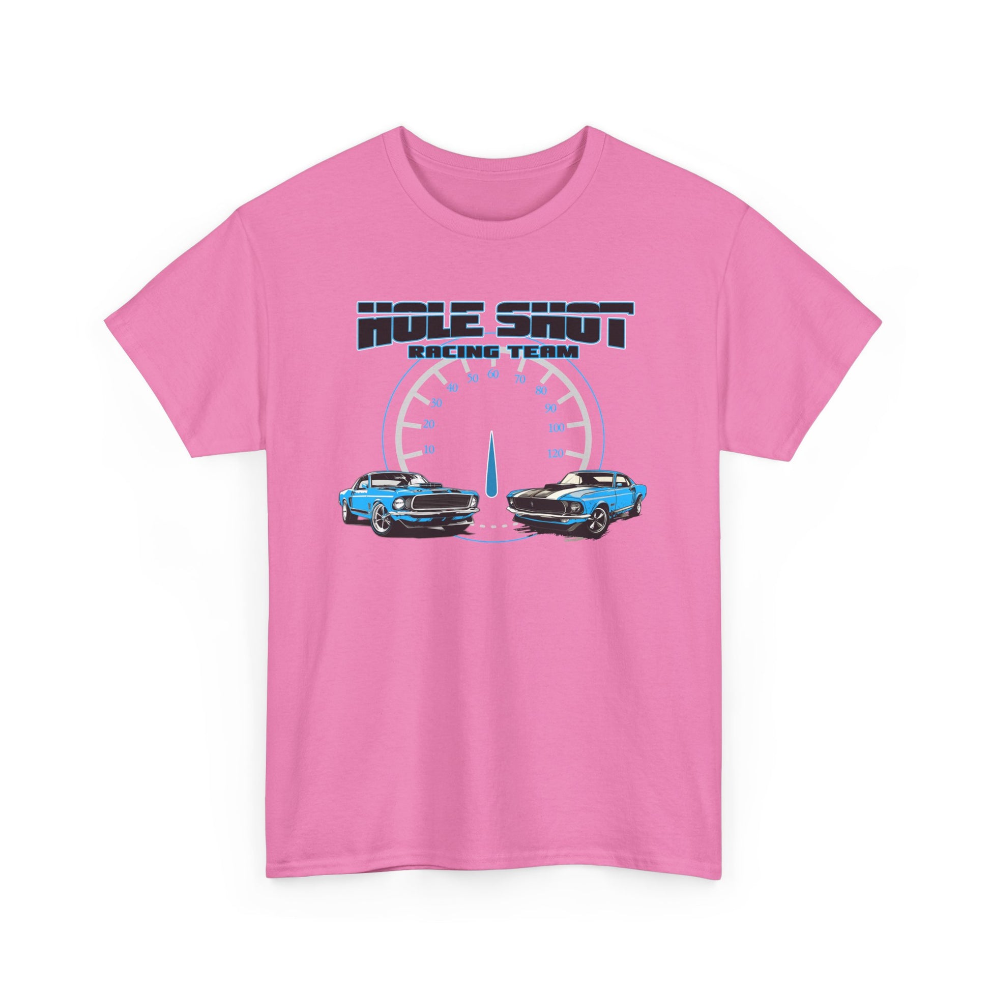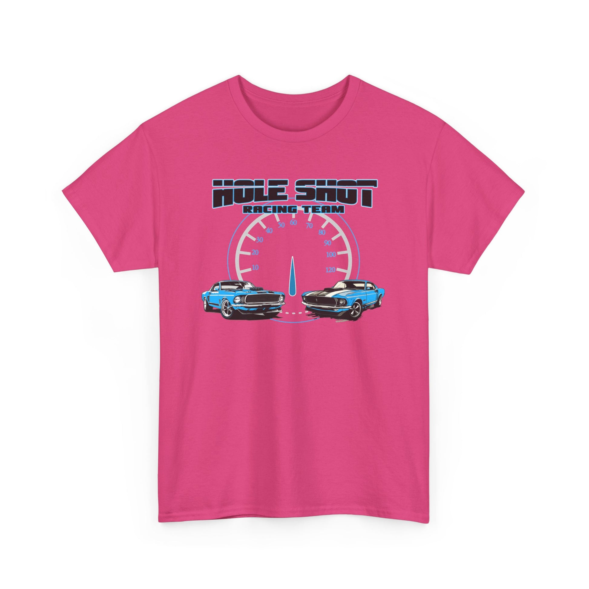 Hole Shot Racing Team graphic tee, perfect for racing enthusiasts and fans. It is printed on a Gildan 5000 Heavy cotton Tee The unisex heavy cotton tee is made from specially spun fibers for strong, smooth fabric, with a ribbed knit collar for shape retention. Ideal for adults, this tee is made in Nicaragua and printed using dual techniques for detailed designs. The classic fit and tear-away label ensure comfort and quality.