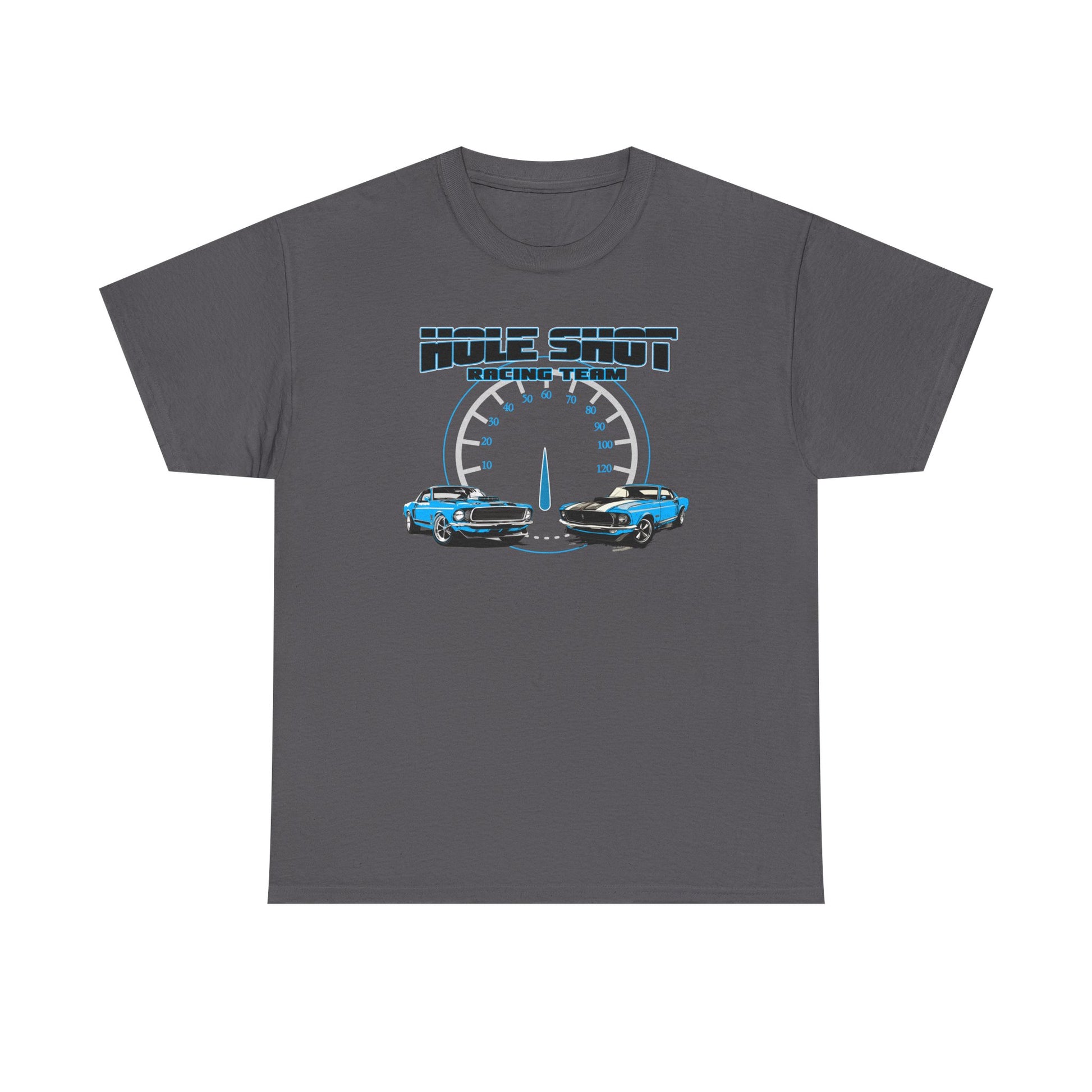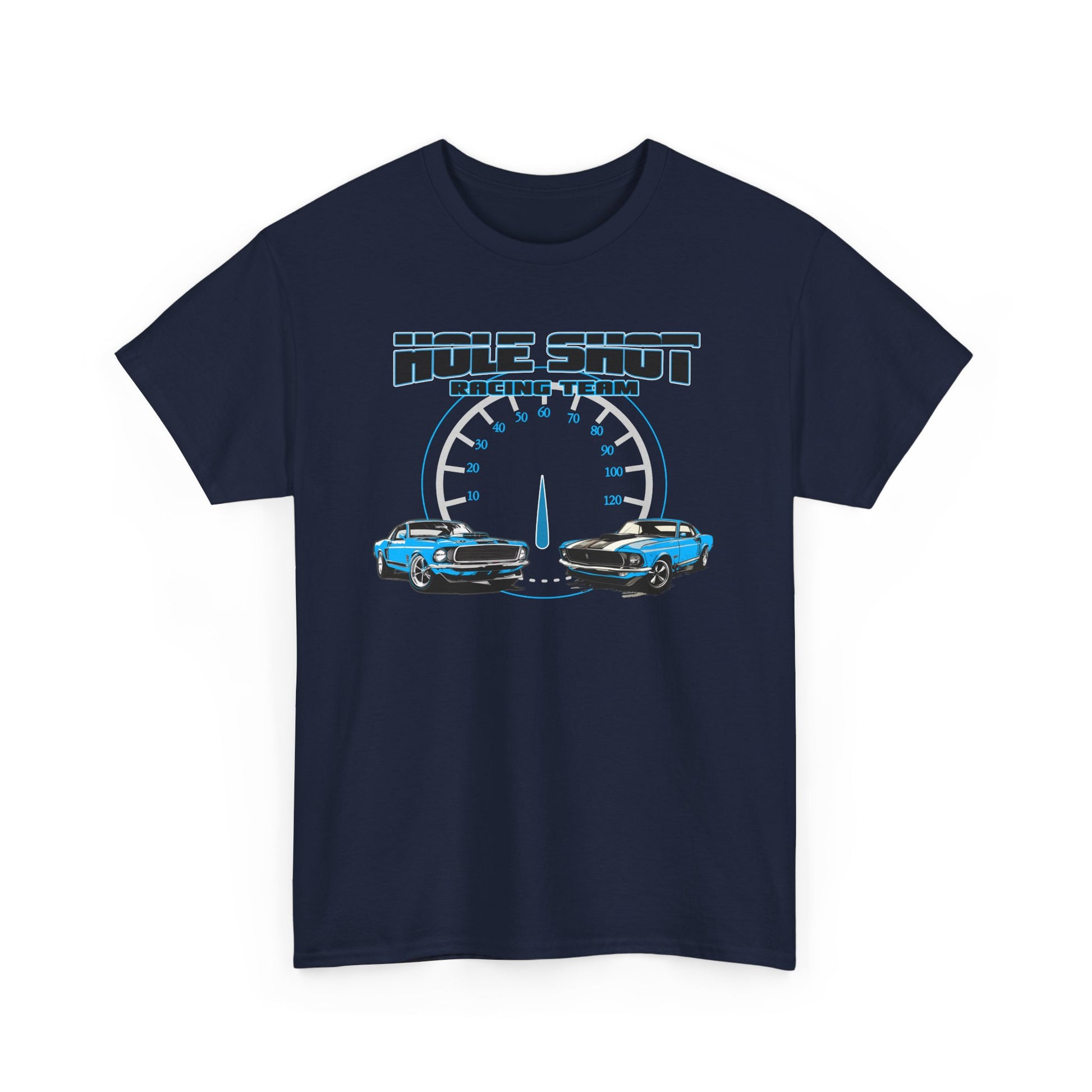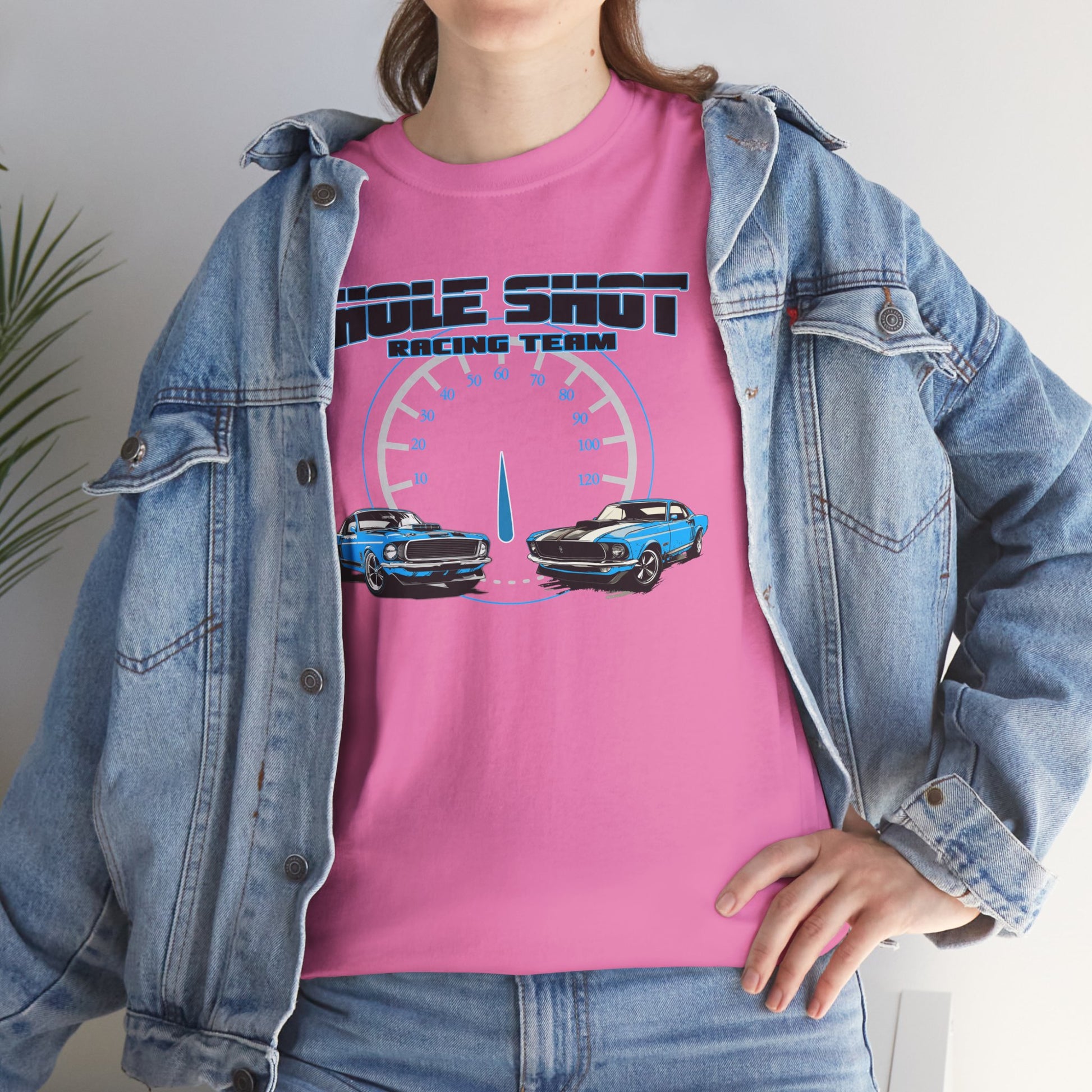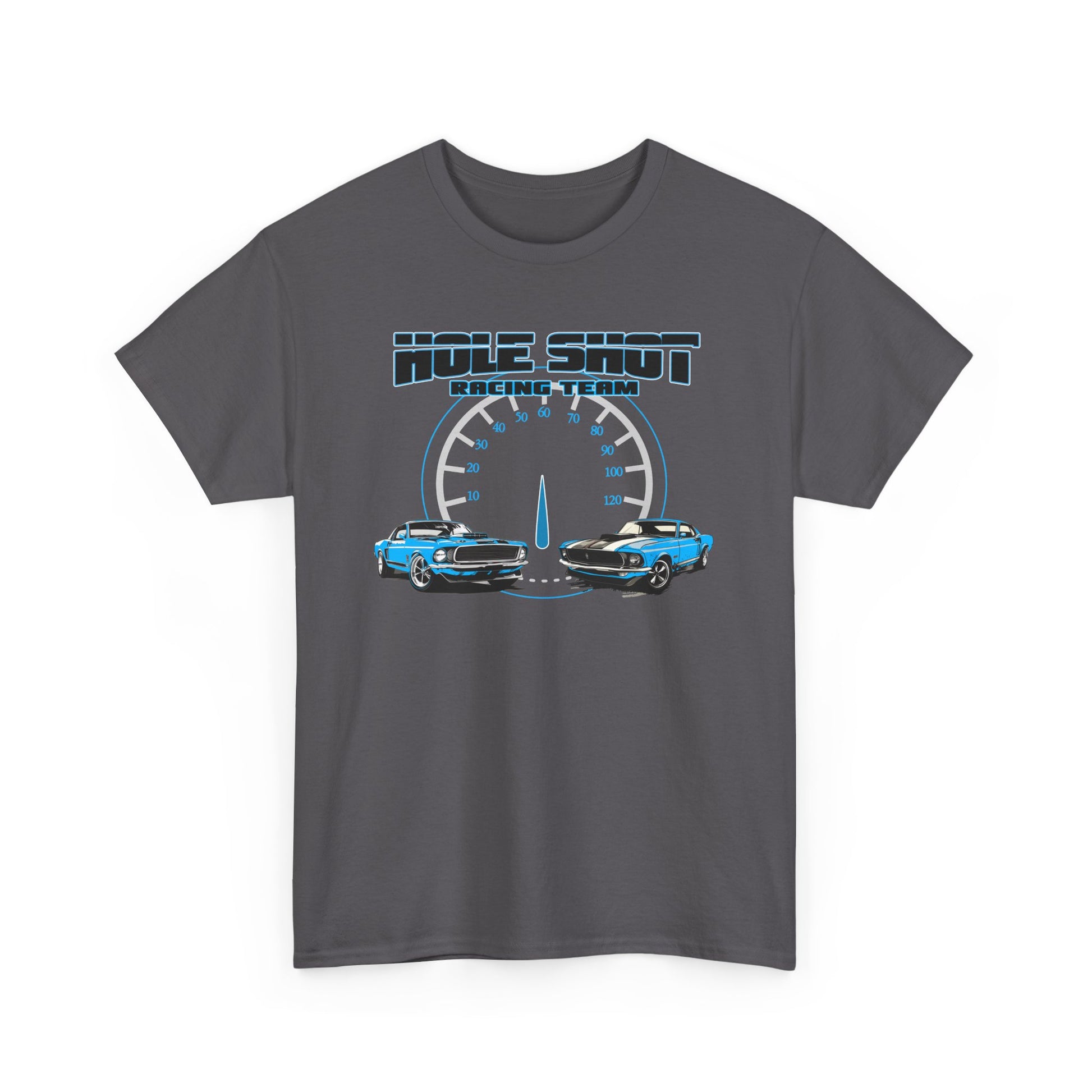 Hole Shot Racing Team graphic tee, perfect for racing enthusiasts and fans. It is printed on a Gildan 5000 Heavy cotton Tee The unisex heavy cotton tee is made from specially spun fibers for strong, smooth fabric, with a ribbed knit collar for shape retention. Ideal for adults, this tee is made in Nicaragua and printed using dual techniques for detailed designs. The classic fit and tear-away label ensure comfort and quality.