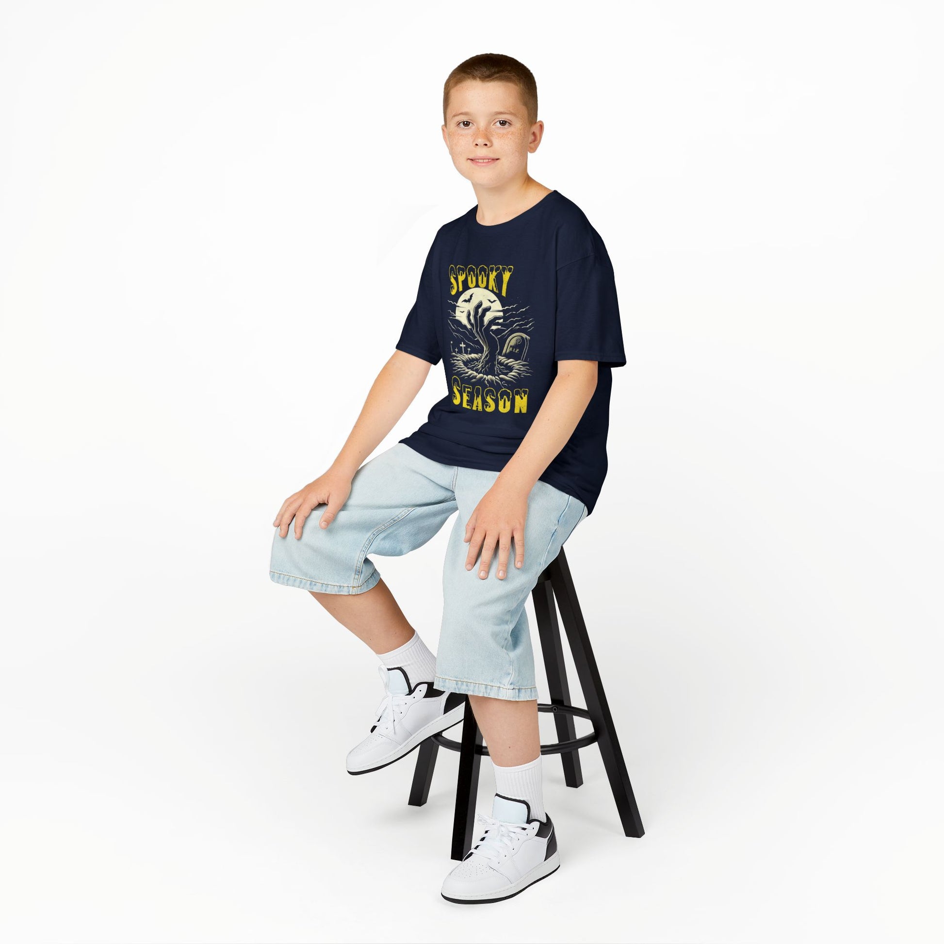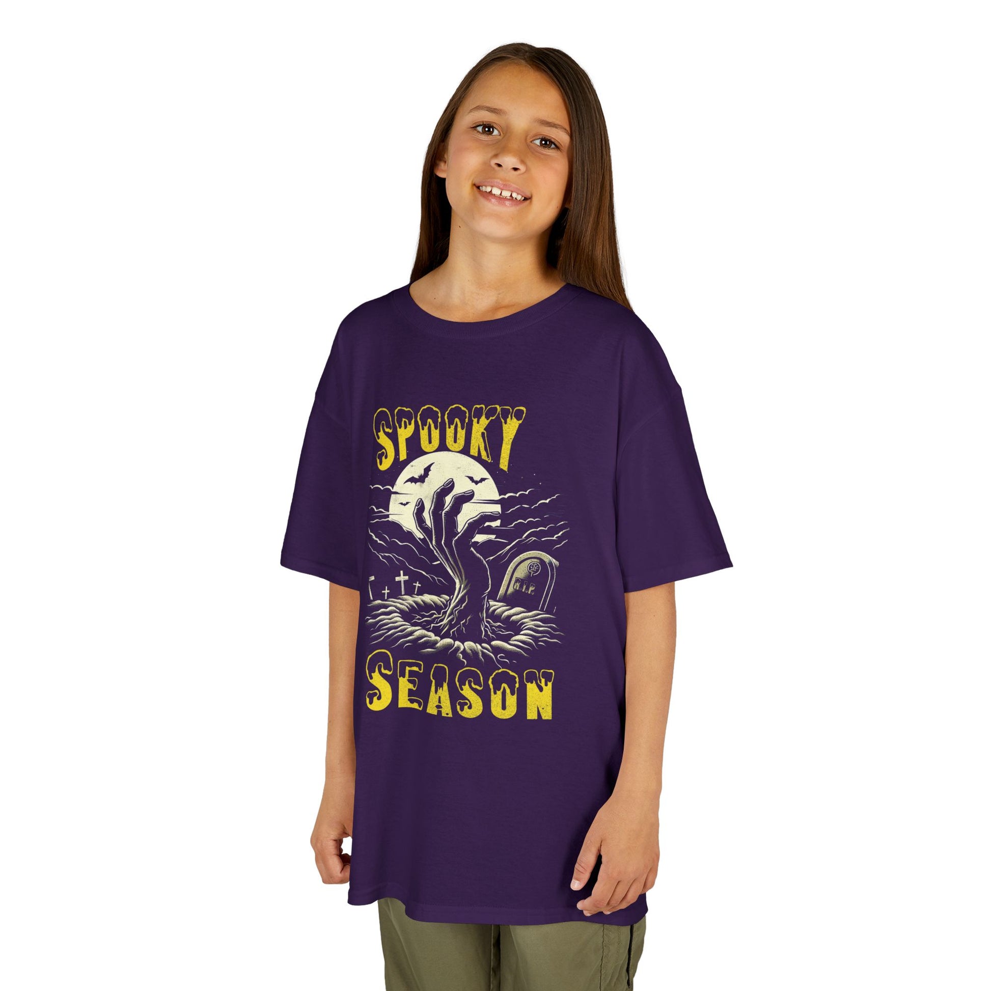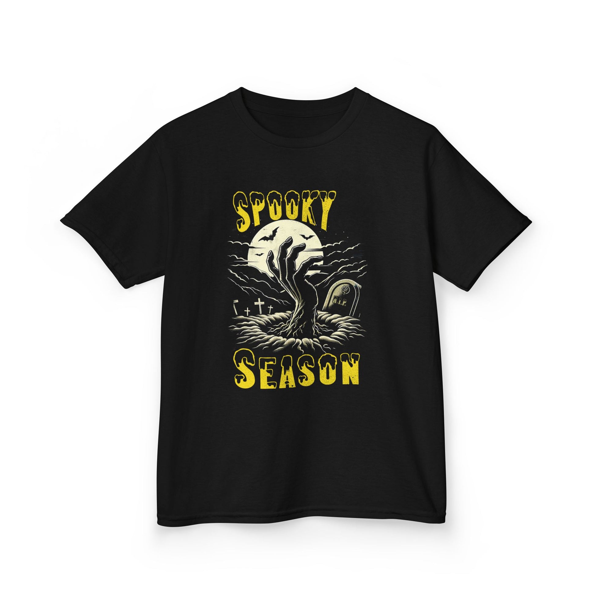 This Kids Spooky Season Halloween Tee is the perfect addition to your child's wardrobe for the upcoming Halloween festivities. The design gives off a spooky and fun vibe, making it ideal for kids who love all things Halloween. Whether they wear it for trick-or-treating or a school Halloween party, this tee will surely make them stand out.