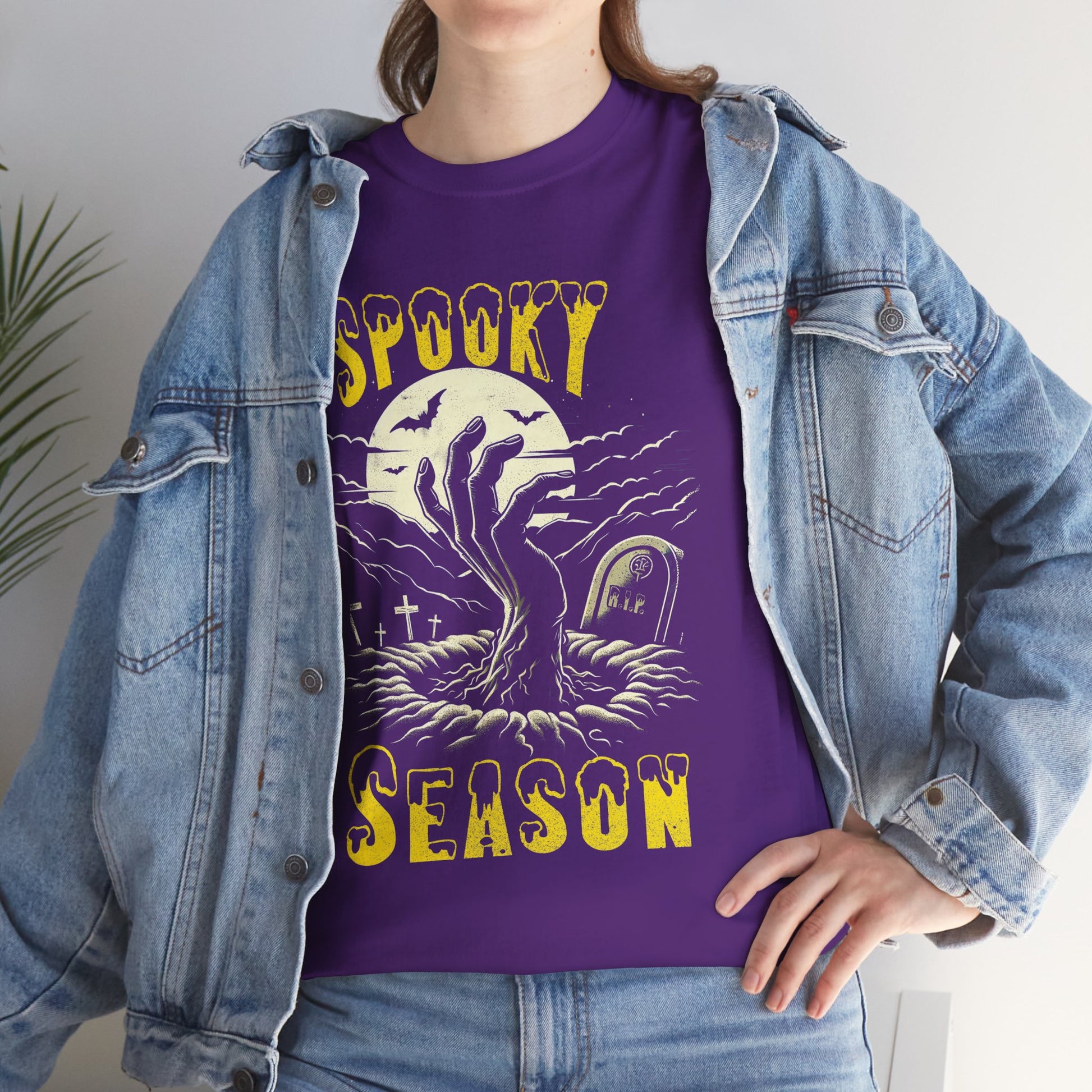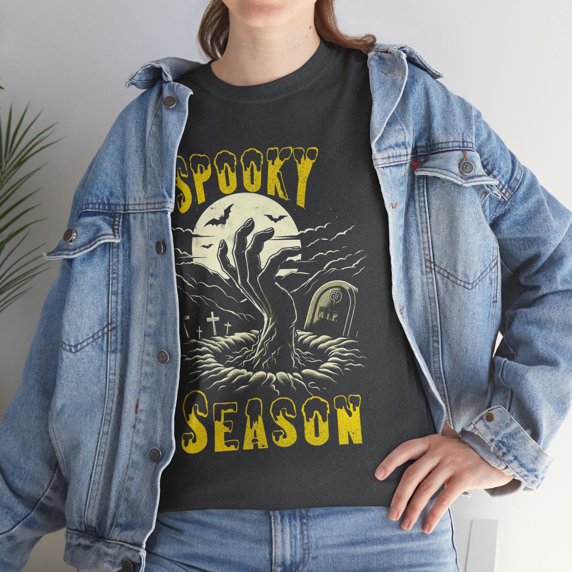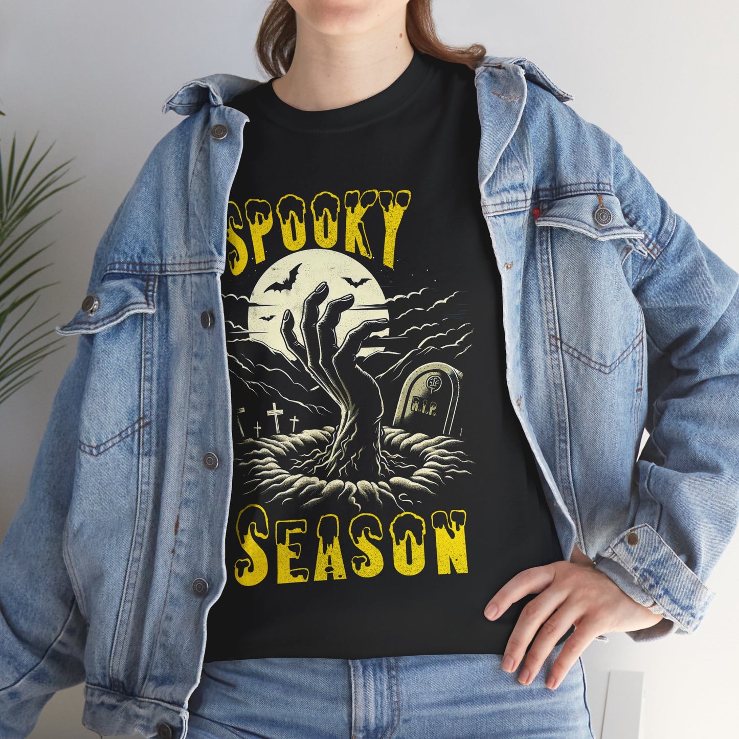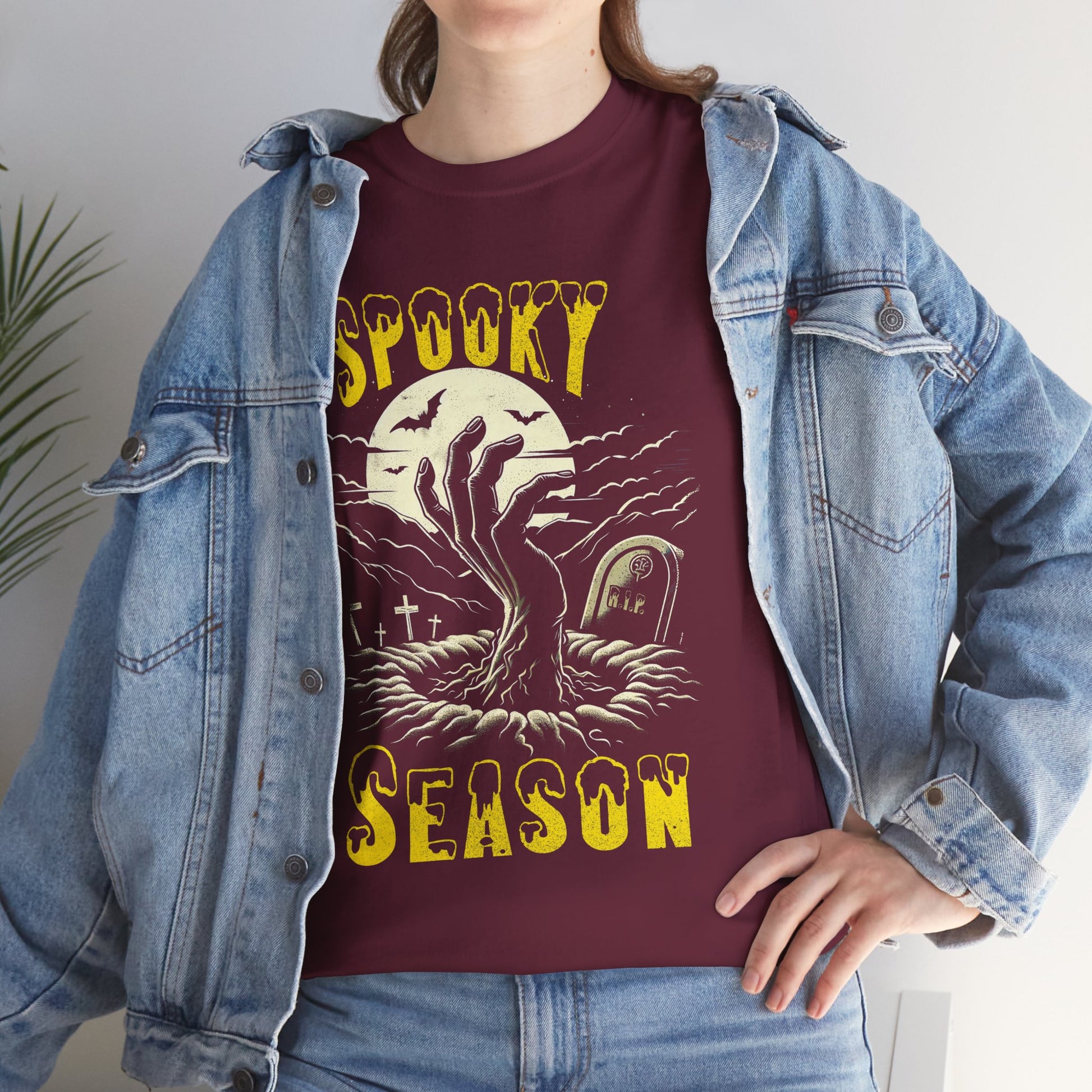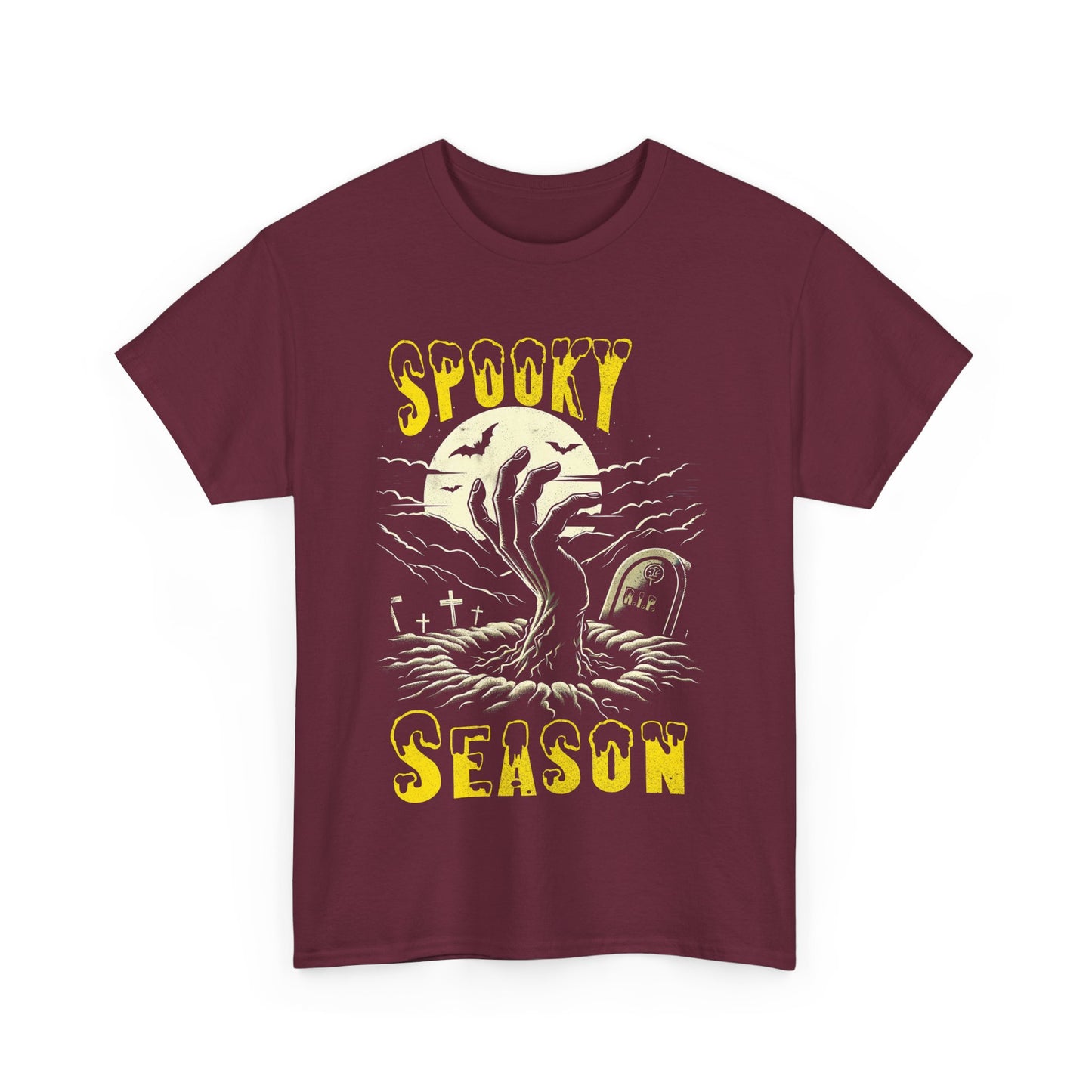 Get in the Halloween spirit with this Spooky Season Halloween Tee! Made from a strong and smooth fabric, this tee features a ribbed knit collar and is designed without side seams for a more attractive look. Perfect for adults looking to embrace the Halloween season with a comfy and timeless tee.