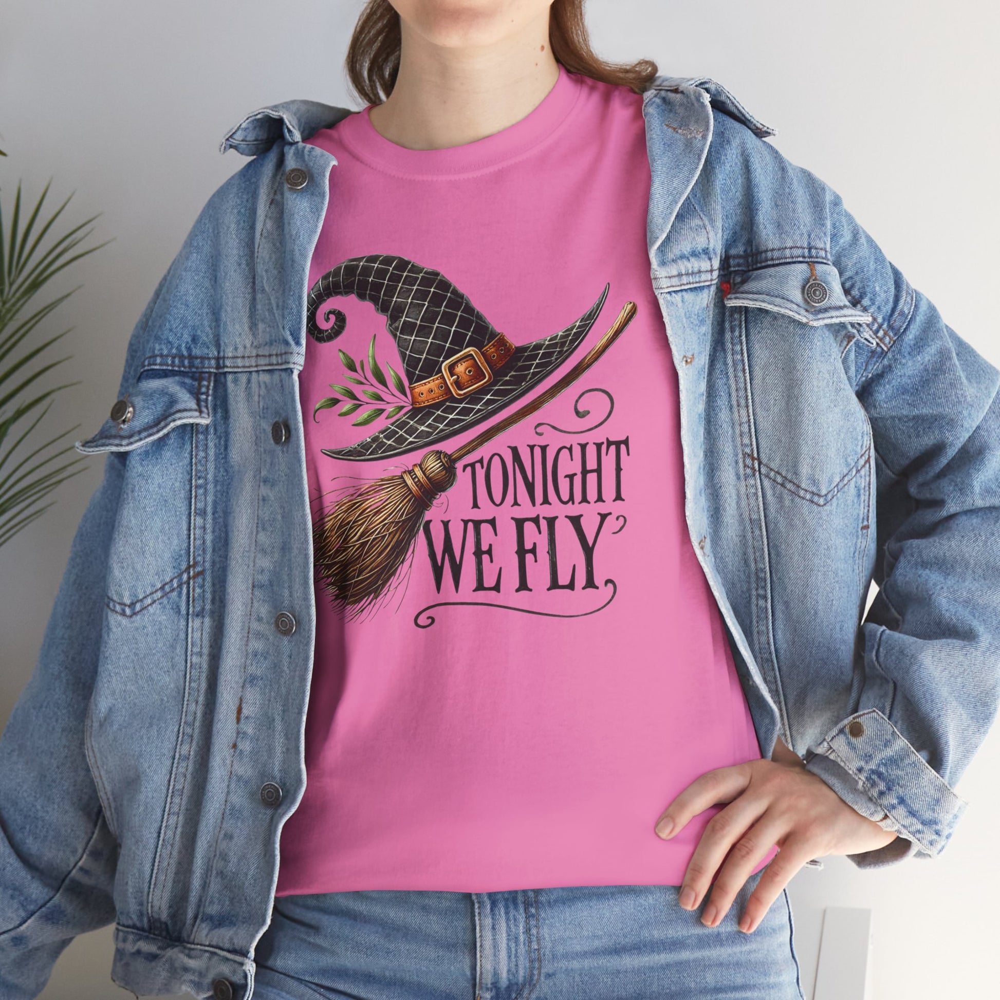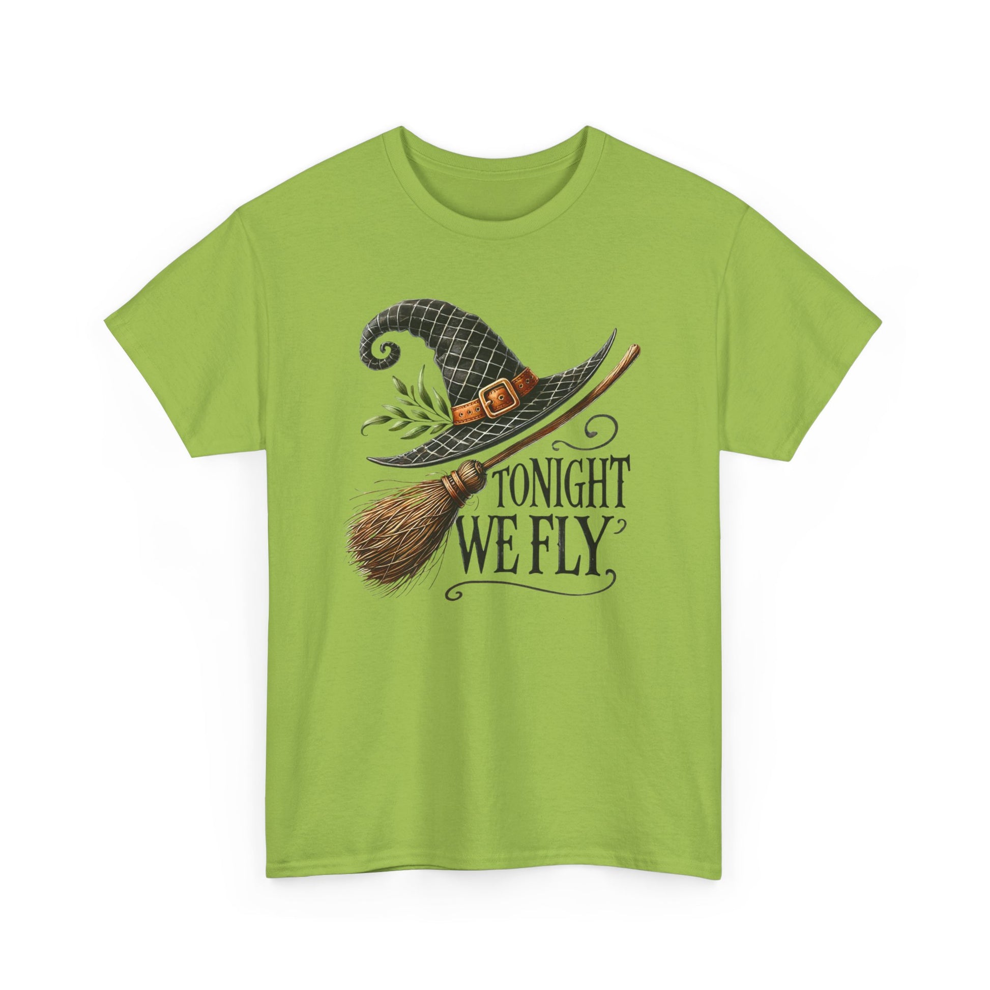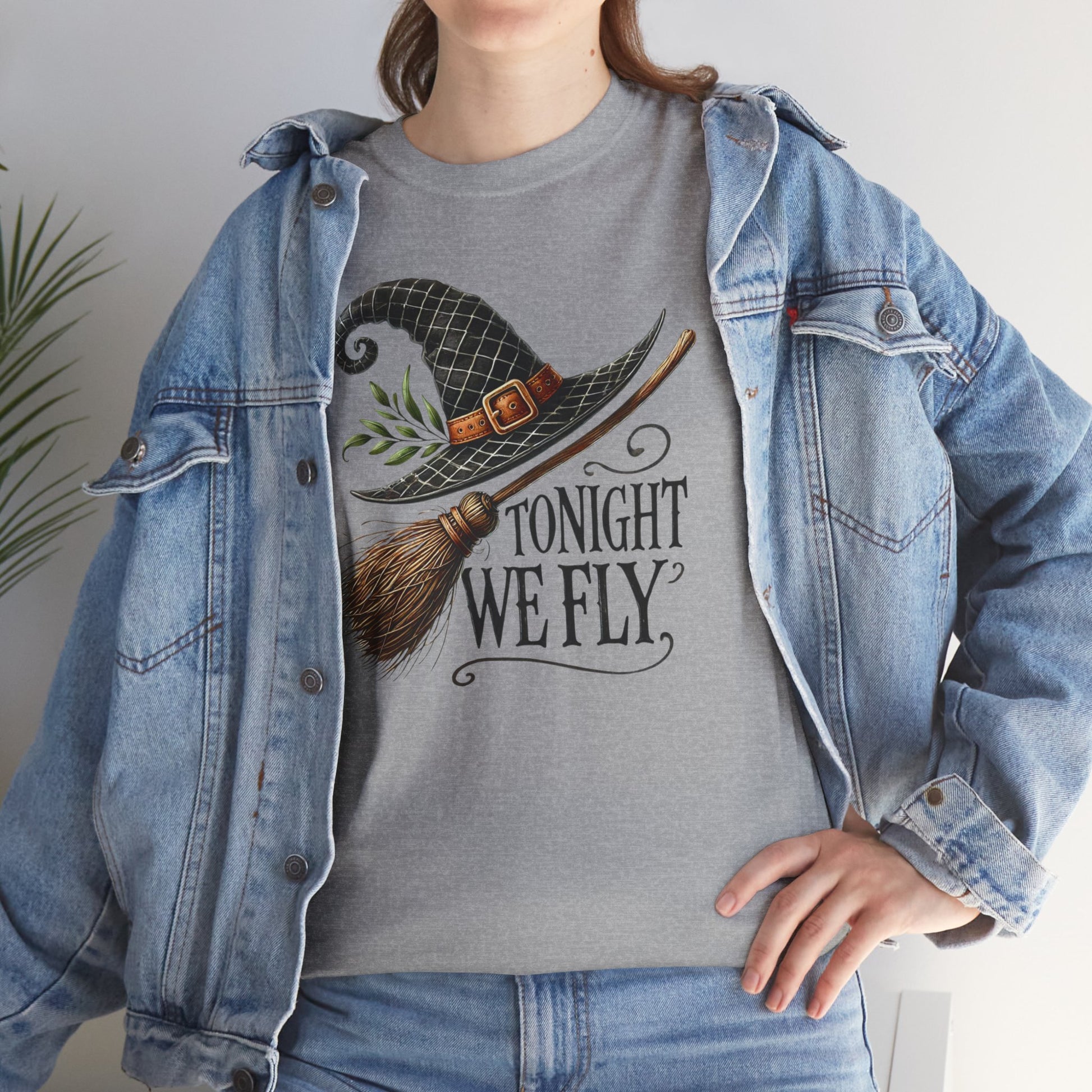 A spooky and festive Halloween tee featuring the words 'Tonight We Fly. Perfect for those who love to celebrate Halloween and embrace the witchy vibes. This tee is ideal for adults who enjoy quirky and unique holiday-themed clothing.