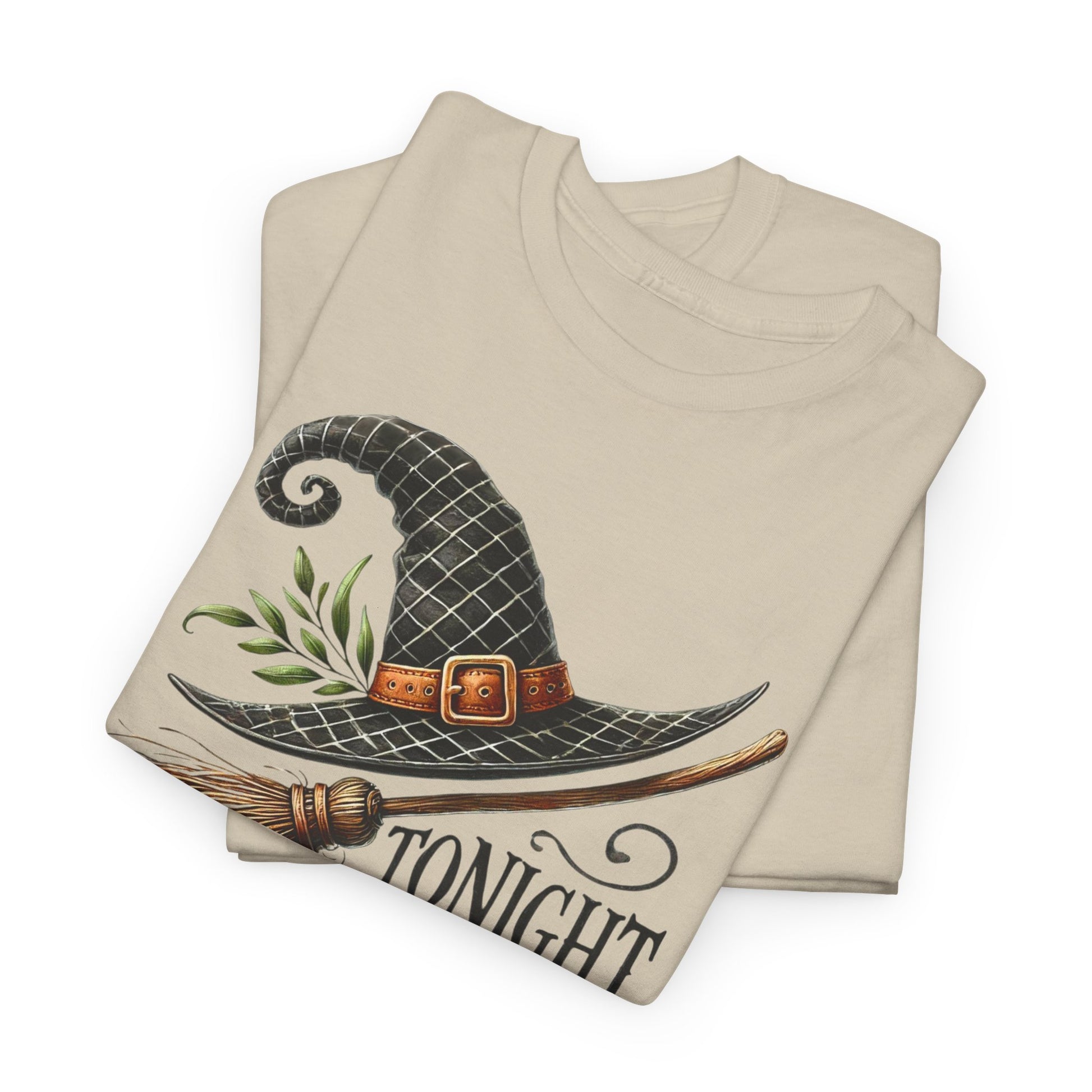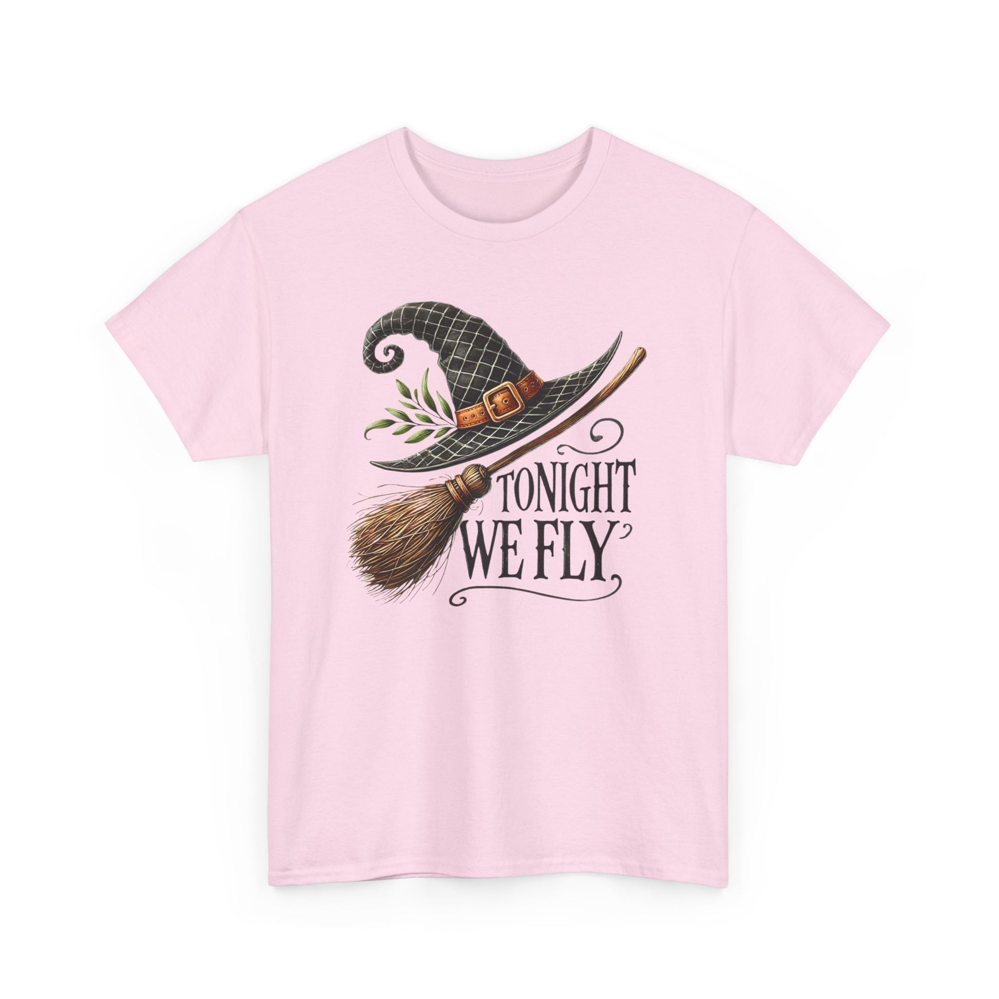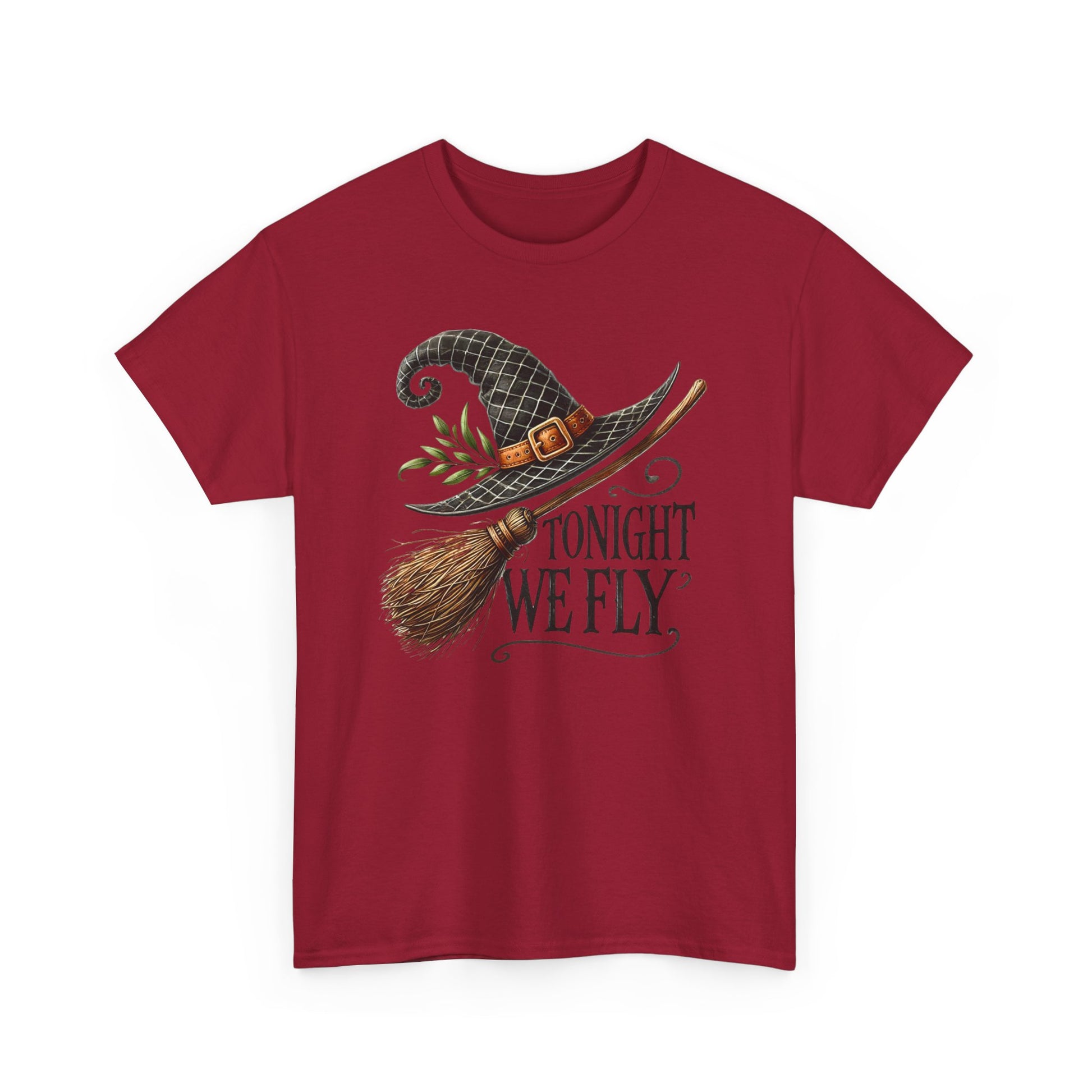 A spooky and festive Halloween tee featuring the words 'Tonight We Fly. Perfect for those who love to celebrate Halloween and embrace the witchy vibes. This tee is ideal for adults who enjoy quirky and unique holiday-themed clothing.