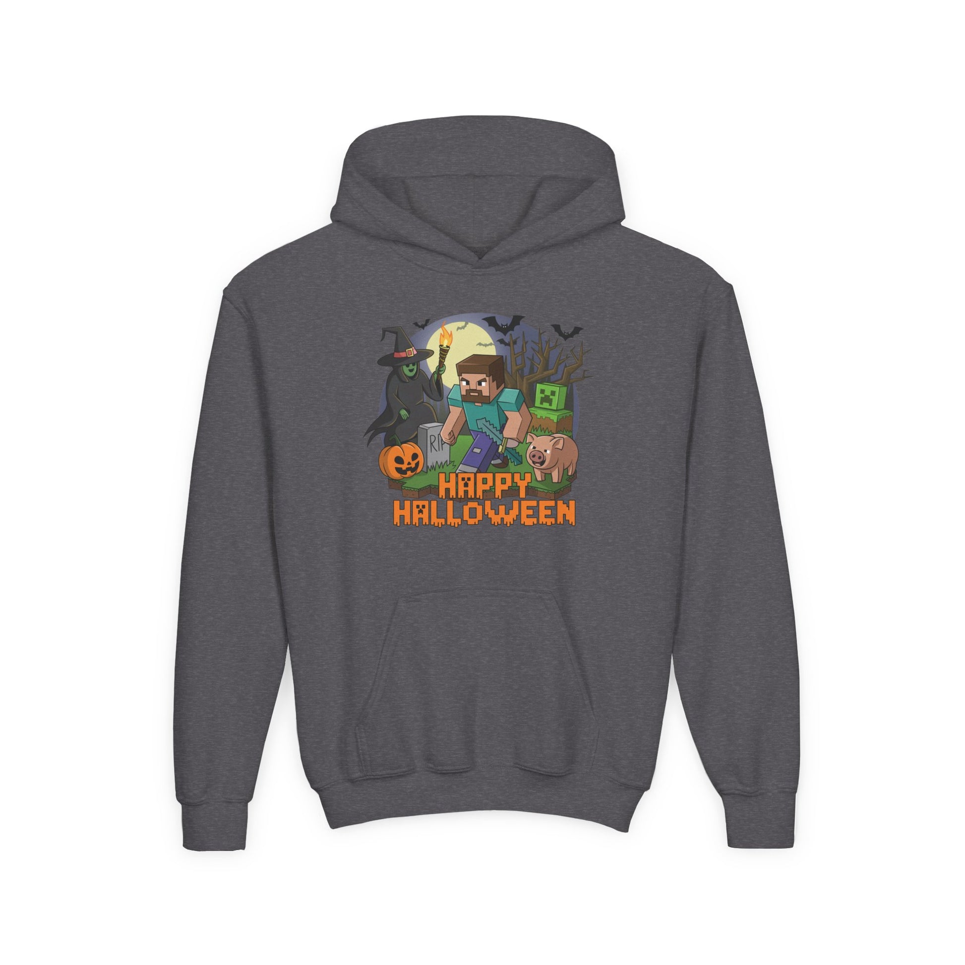 A cozy Youth Halloween Hoodie perfect for children to wear during the spooky season. This hoodie features a kangaroo pouch pocket to keep hands warm and a twill necktape for added comfort. Made from a blend of 50% cotton and 50% polyester, this medium fabric hoodie is both strong and smooth, making it great for printing. It is ideal for Halloween celebrations and trick-or-treating.